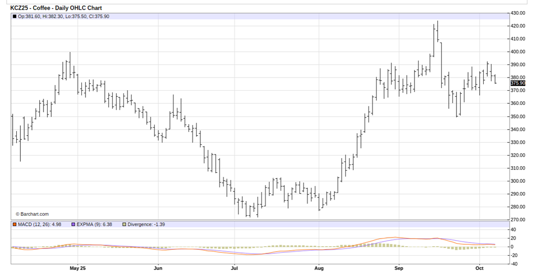 1 Way to Trade Cold Coffee Prices Now as Global Supply Fears Percolate![]() December coffee (KCZ25) futures present a selling opportunity on more price weakness. See on the daily bar chart for December arabica coffee futures that recent price action has formed a bearish “head-and-shoulders” top reversal pattern. See, too, at the bottom of the chart that the moving average convergence divergence (MACD) indicator is in a bearish posture as the blue MACD line is below the red trigger line and both lines are trending lower. Fundamentally, coffee futures prices are likely to fall further due to increasing global coffee supplies amid favorable weather in major coffee-producing countries like Brazil and Vietnam, which has led to higher production. Global coffee demand likely won’t match the higher world supplies, prompting price pressure on coffee futures. A move in December coffee futures below chart support at 367.00 cents would give the bears more power and it would also become a selling opportunity. The downside price objective would be 295.00 cents or below. Technical resistance, for which to place a protective buy stop just above, is located at 400.00 cents. ![]() IMPORTANT NOTE: I am not a futures broker and do not manage any trading accounts other than my own personal account. It is my goal to point out to you potential trading opportunities. However, it is up to you to: (1) decide when and if you want to initiate any trades and (2) determine the size of any trades you may initiate. Any trades I discuss are hypothetical in nature. Here is what the Commodity Futures Trading Commission (CFTC) has said about futures trading (and I agree 100%):