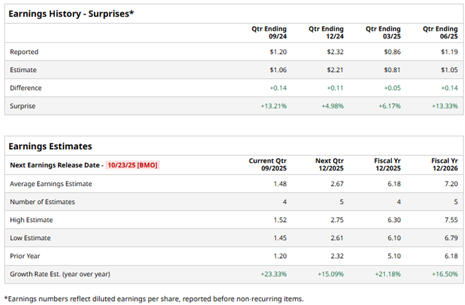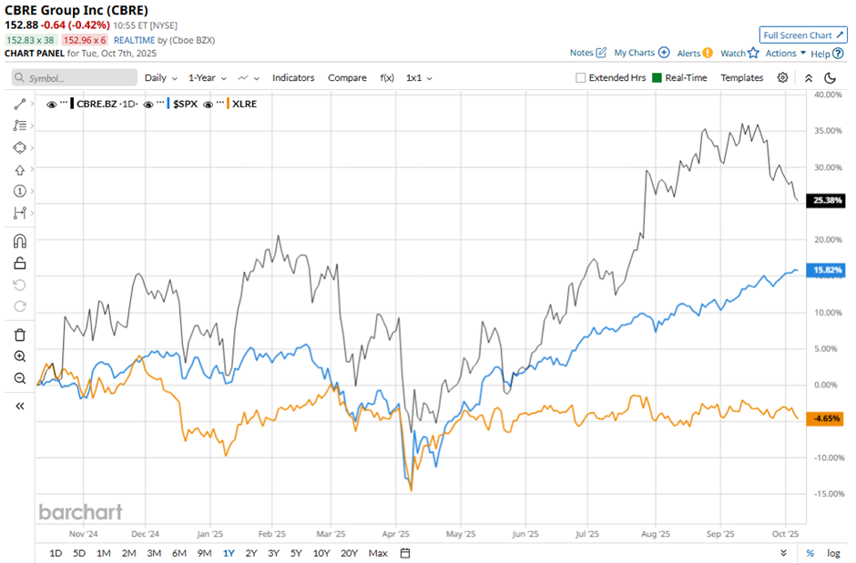 CBRE Group's Quarterly Earnings Preview: What You Need to Know![]() With a market cap of $45.7 billion, CBRE Group, Inc. (CBRE) is a leading global commercial real estate services and investment firm operating across the United States, the United Kingdom, and internationally. It provides a comprehensive range of services through its three business segments: Advisory Services; Global Workplace Solutions; and Real Estate Investments, serving tenants, owners, investors, and occupiers worldwide. The Dallas, Texas-based company is expected to release its fiscal Q3 2025 earnings results before the market opens on Thursday, Oct. 23. Ahead of this event, analysts project CBRE Group to report a core EPS of $1.48, reflecting an increase of 23.3% from $1.20 in the year-ago quarter. The company holds a solid track record of consistently surpassing Wall Street's bottom-line estimates in the last four quarterly reports. For fiscal 2025, analysts forecast the provider of real estate investment management services to report core EPS of $6.18, up 21.2% from $5.10 in fiscal 2024. ![]() CBRE stock has soared over 28% over the past 52 weeks, outperforming the broader S&P 500 Index's ($SPX) 18.4% gain and the Real Estate Select Sector SPDR Fund's (XLRE) 4.1% decline over the same time frame. ![]() Shares of CBRE surged 7.8% on Jul. 29 after the company reported stronger-than-expected Q2 2025 results, with core EPS of $1.19, surpassing analyst estimates. Revenue rose 16.2% year-over-year to $9.75 billion, beating Wall Street forecasts and reflecting robust demand in leasing and property segments. Additionally, CBRE raised its full-year core profit forecast to $6.10 per share - $6.20 per share, driven by a 14% increase in U.S. leasing revenue and an 18% rise in EMEA leasing, further boosting investor confidence. Analysts' consensus view on CBRE stock is moderately optimistic, with an overall "Moderate Buy" rating. Among 12 analysts covering the stock, seven suggest a "Strong Buy," two give a "Moderate Buy," and three recommend a "Hold." The average analyst price target for CBRE Group is $175.20, indicating a potential upside of 14.6% from the current levels. On the date of publication, Sohini Mondal did not have (either directly or indirectly) positions in any of the securities mentioned in this article. All information and data in this article is solely for informational purposes. For more information please view the Barchart Disclosure Policy here. |