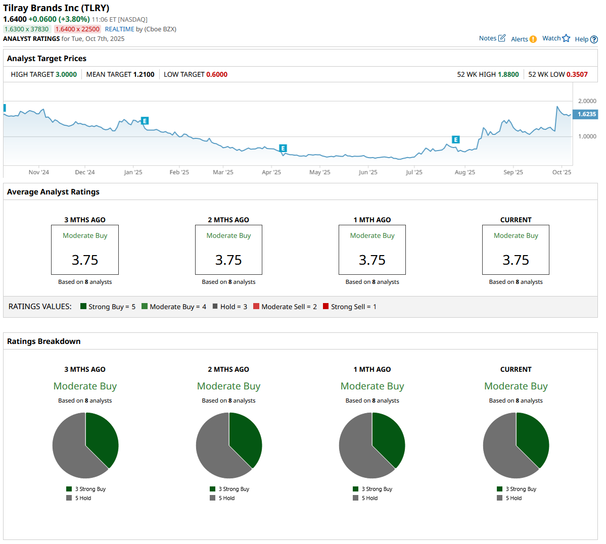 As Tilray Expands Its Medical Cannabis Business, Should You Buy, Sell, or Hold TLRY Stock?![]() Tilray’s (TLRY) aggressive expansion into Germany’s medical cannabis scene signals a drive to claim more of the global spotlight. The company posted fiscal 2025 highlights that include $821 million in net revenue, up 4%, and a jump in cannabis segment gross margin from 33% to 40%. This financial delivery comes as Tilray strengthened its balance sheet, cutting debt by nearly $100 million and building a $256 million liquidity buffer. All this is happening as the cannabis sector is gaining traction, as global market value could approach $444 billion by 2030. The recent surge in optimism, especially after high-profile endorsements and stronger legalization trends, has reignited momentum across medical cannabis players. That’s why Tilray’s latest five-product rollout in Germany comes at such a pivotal moment. The question now is whether the launch makes TLRY worth a buy, a sell, or a hold. Let’s find out. What TLRY’s Earnings RevealTilray operates as a diversified cannabis and wellness company, focusing on medical cannabis, beverages, and other consumer products. The company currently does not pay a dividend. The stock price stands at $1.64, with a year-to-date (YTD) increase of 21.8%, though its 52-week performance shows a decline of 1.8%. ![]() With a market capitalization of approximately $1.78 billion, Tilray is valued at a fraction of the sector median. Its price-to-sales (P/S) ratio is 2.17x compared to the sector median of 4.18x. The price-to-cash flow (P/CF) stands at 11.21x, below the sector median of 14.81x, while the price-to-book (P/B) ratio is 1.15x, significantly lower than the sector’s 2.78x median. These valuation metrics suggest Tilray trades at a discount relative to its cannabis peers. Tilray’s fiscal year 2025 earnings, released on July 28, reflect steady progress despite strategic challenges. The company achieved net revenue of $821 million, increasing 4% from $789 million the prior year. That figure rises to $834 million when adjusted for constant currency. This revenue growth was partly tempered by a $35 million impact from international permit delays and strategic priorities in Canada, including a $15 million revenue hit from deemphasizing vape products. This helped Tilray preserve higher margins in more profitable segments. While TLRY reported a net loss of $2.18 billion, this included a significant non-cash impairment of goodwill and intangible assets totaling $2.1 billion. Adjusted net income rose 45% to $9 million, with adjusted earnings per share stable at $0.01. Adjusted EBITDA came in at $55 million, slightly below the prior year. The company holds a strong liquidity position, with $256 million in cash and marketable securities. It reduced bank indebtedness by $10.9 million and cut net long-term debt substantially, repaying nearly $100 million in convertible debt year-to-date. Tilray’s financial discipline and strategic recalibration position it well for further growth. What’s Driving Tilray’s MomentumThe sector’s spotlight is locked on Tilray after an apparent endorsement of medical cannabis by President Donald Trump. The president shared a video on Truth Social promoting cannabidiol’s potential to “revolutionize senior healthcare,” estimating a possible $64 billion in annual medical cost savings. This, combined with previous public comments on reclassification, has lit up investor optimism. It’s fueling expectations for broad adoption of CBD products and triggering hope for friendlier regulatory changes, especially moves that could see marijuana reclassified and make more room for companies like Tilray to grow. It’s no surprise the timing favors Tilray. The company just expanded its premium craft cannabis portfolio in Germany with five new locally produced cannabis flower products. These are crafted at the EU-GMP-certified facility in Neumünster and launched as part of the BfArM in-country cultivation program. The new entries include a wide range of THC potencies: THC30 TRM (Triangle Mints), THC28 TRM (Triangle Mints), THC28 PPV (Platinum Pave 34), THC25 PPV (Platinum Pave 34), and THC22 SNS (Sunset Sherbet). Each product aims for precision and quality, bringing uniform dosing and reliability to German pharmacies. Tilray’s production meets strict EU-GMP standards, ensuring patients get consistency and safety with every prescription. This expansion is about Tilray deepening its roots in Europe’s biggest and most important medical cannabis market. What Analysts and Estimates ImplyTilray’s upcoming earnings release, scheduled for Oct. 9, holds considerable significance. Analysts estimate the adjusted earnings per share for the current quarter to be -$0.03, matching the estimate for the next quarter in November. For the full fiscal year ending May 31, 2026, the average earnings estimate dips to -$0.11 per share, reflecting some caution for future profitability. Despite this, management’s guidance points to optimism. Irwin D. Simon, Chairman and Chief Executive Officer (CEO), underscored the company’s potential in cannabis, beverage, and wellness product lines as key growth drivers for fiscal 2026. Tilray expects its adjusted EBITDA for the fiscal year 2026 to range between $62 million and $72 million. This represents a growth of 13% to 31% compared to fiscal 2025, signaling that operational improvements could start translating into stronger financial performance. The consensus among analysts, based on eight surveyed experts, skews moderately bullish with an overall “Moderate Buy” rating. They assign an average price target of $1.21 to TLRY stock, implying a downside potential of approximately 26%. ConclusionTilray has made some bold moves and generated a real buzz with its German expansion and renewed sector optimism. But even with impressive product launches and a more confident balance sheet, analysts see the near-term 